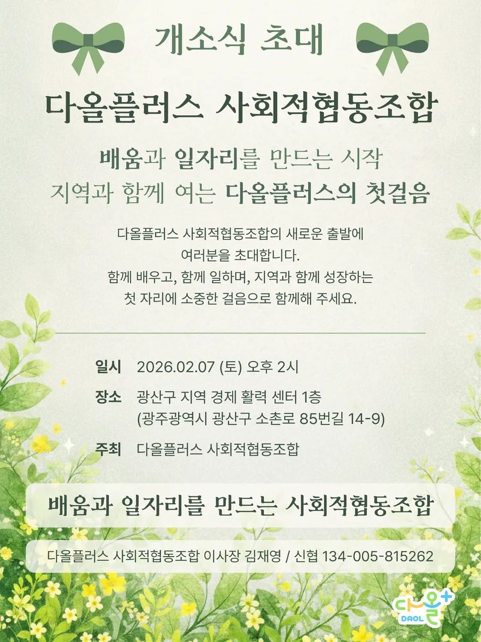 2026년 2월 7일(토) 오후2시 광산구지역경제활력센터 1층에서 여러분과 함께 문을 열고자 합니다.